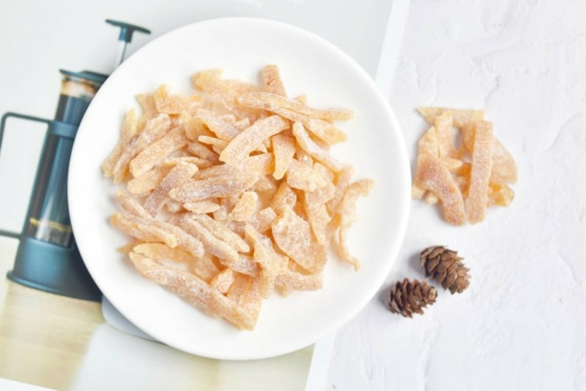 鹽津陳皮有多道工序,我們挑選新鮮橘子,清除表面雜質,剝取果皮,經過白糖漬製,去除微澀,保留酸甜。最後再經過自然曬乾清晰。輔料泡醃多次反復製成。