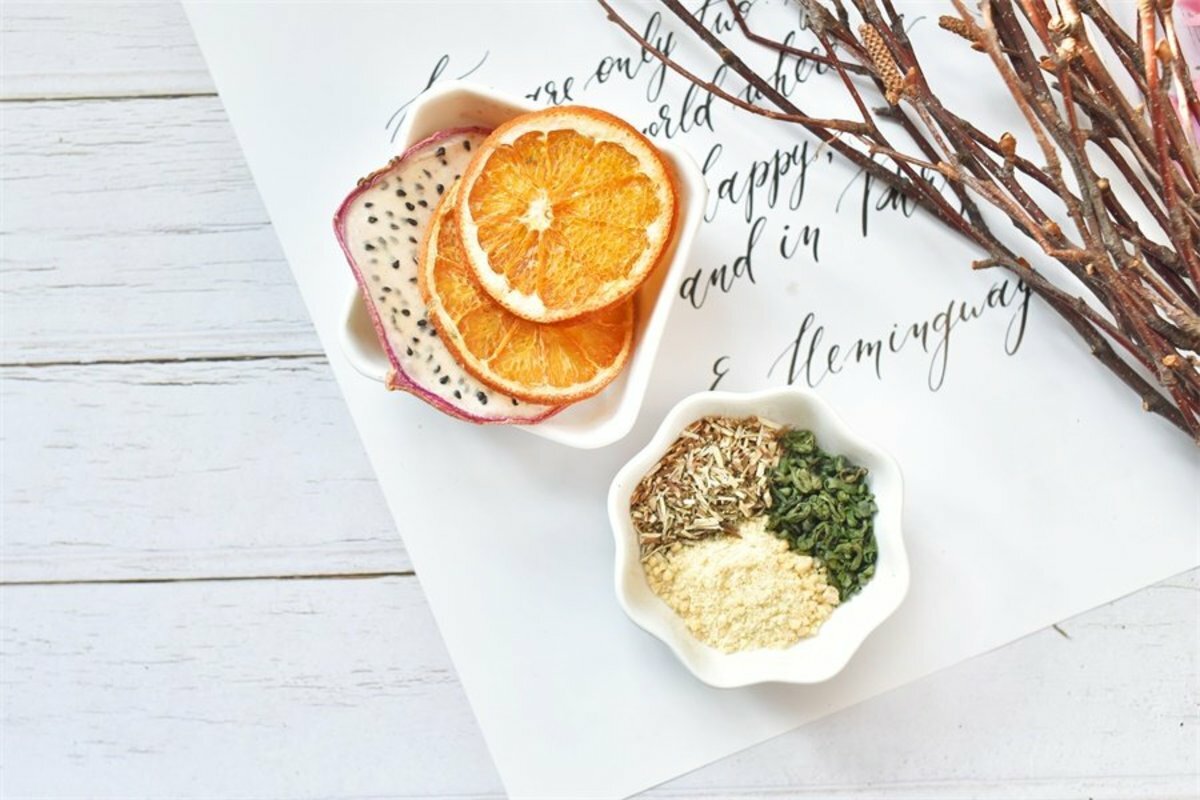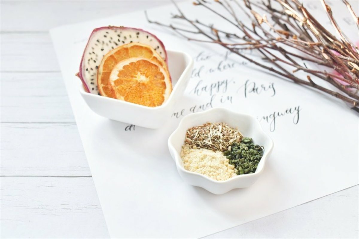1.取果乾和茶包,加入300ml-500ml约80℃热水冲泡
