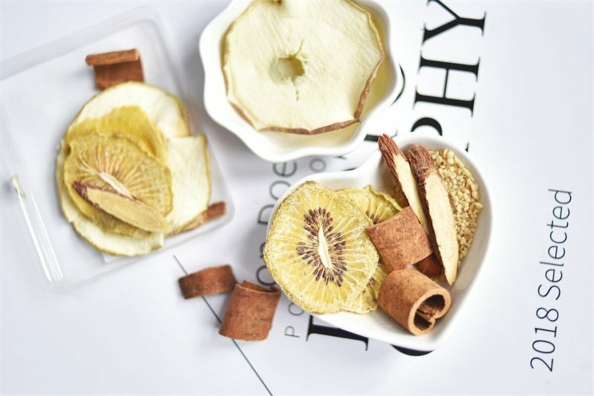 1.取果乾和茶包,加入300ml-500ml约80℃热水冲泡