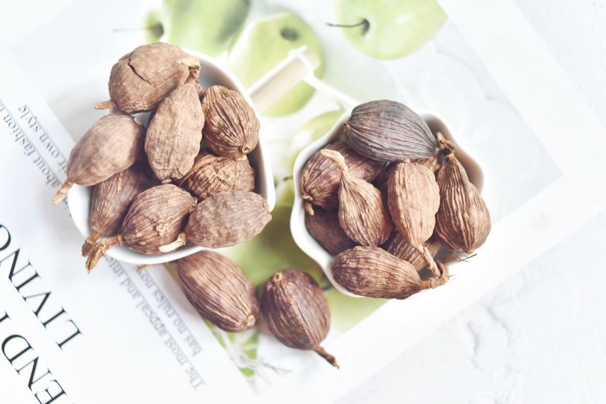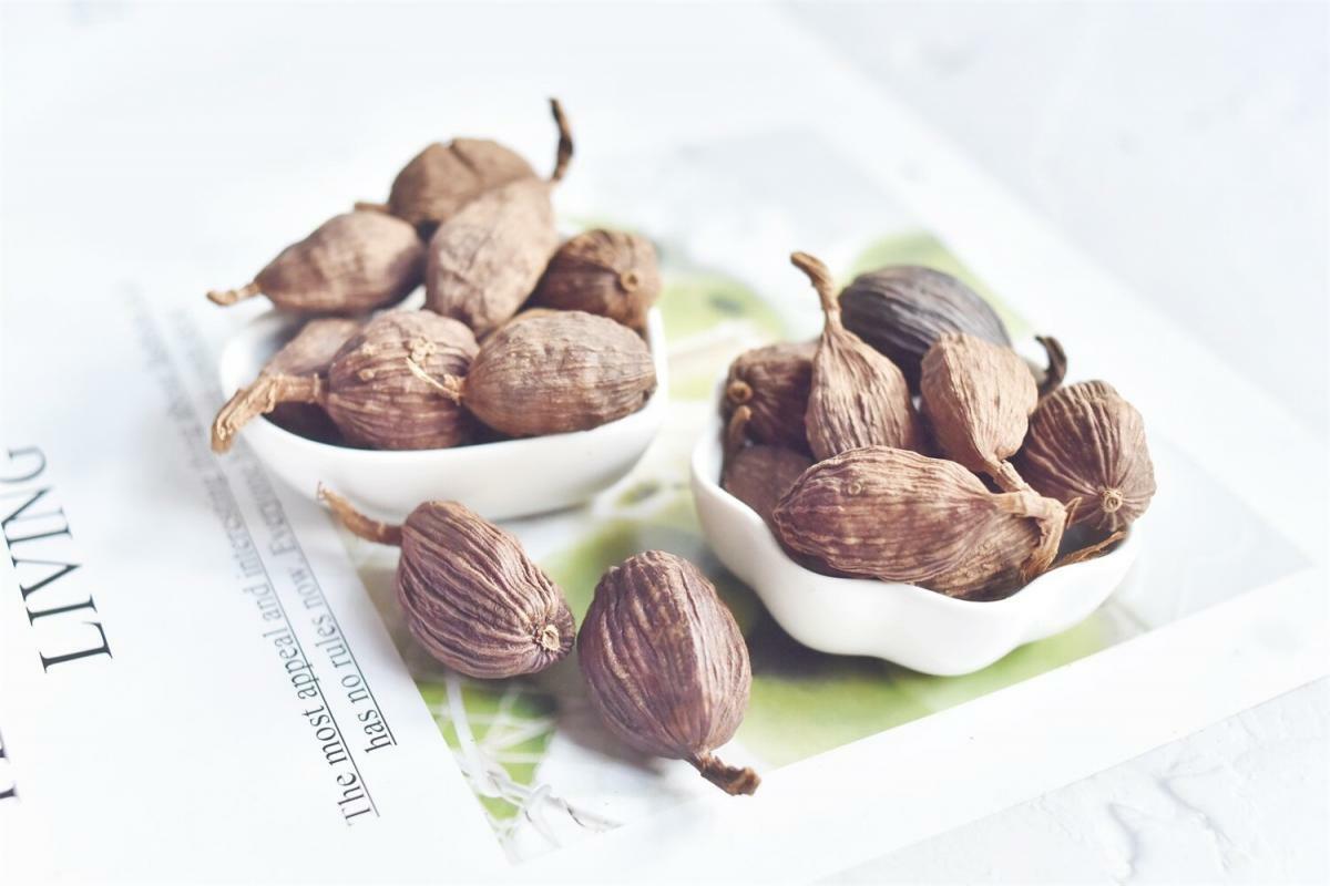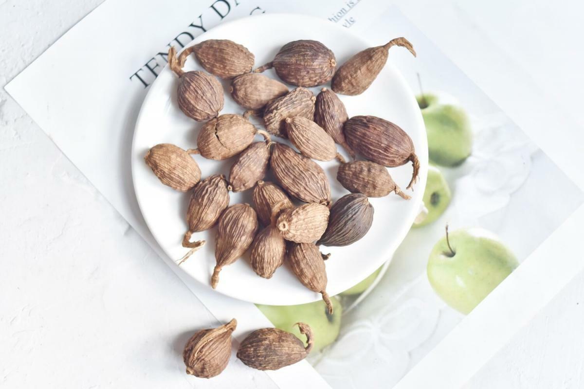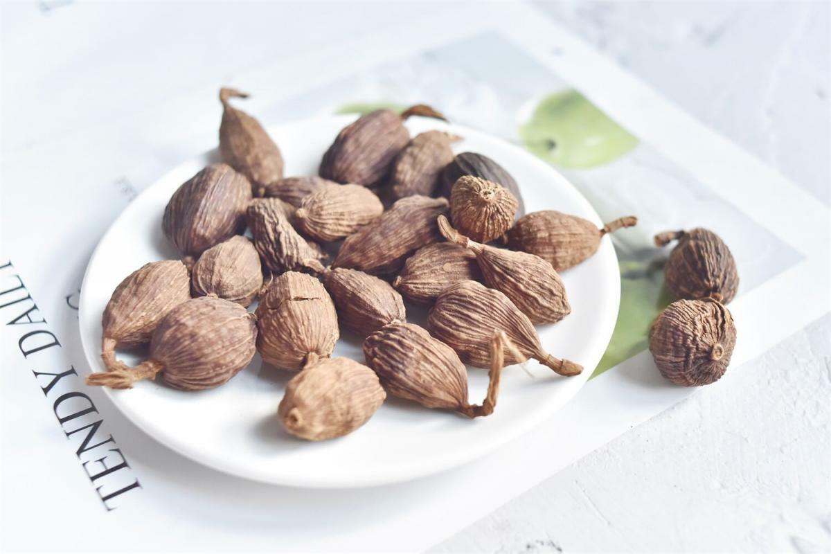 草果,為薑科植物草果的乾燥成熟果實,多年生草本,生於溝邊林下,分佈於廣西和雲南南部地區,果實成熟呈紅褐色時採收,曬乾或烘乾,或用沸水燙2~3分鐘後,再曬乾或烘乾。草果是藥食兩用物質,食用量大於藥用量。具有燥濕化痰、調氣消食、祛寒止痛等功效。